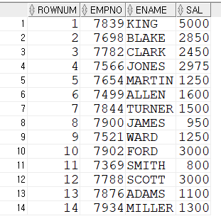 ROWNUM 함수는 : order by 절 없이 출력되는, 행 그대로 번호를 부여할 수 있는 shadow (감춰진) 컬럼