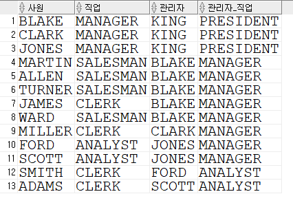 select e.ename as 사원 , e.job as 직업 , m.ename as 관리자 , m.job as 관리자_직업