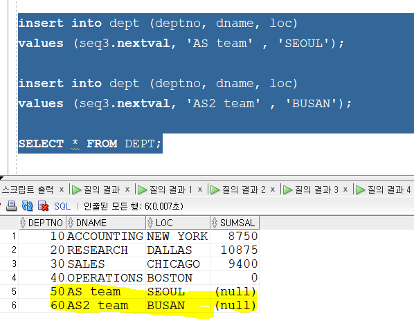 values (seq3.nextval, 'AS team' , 'SEOUL');