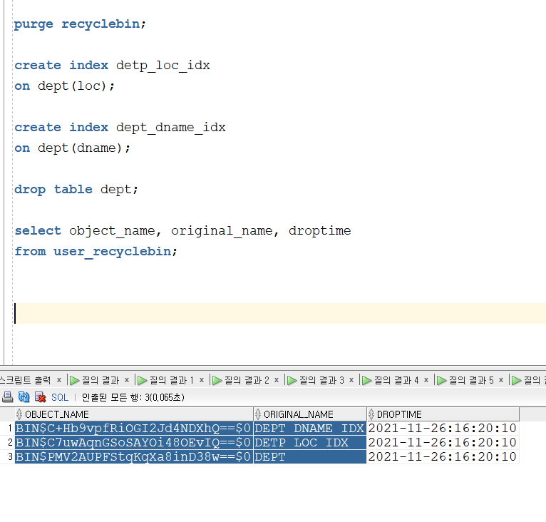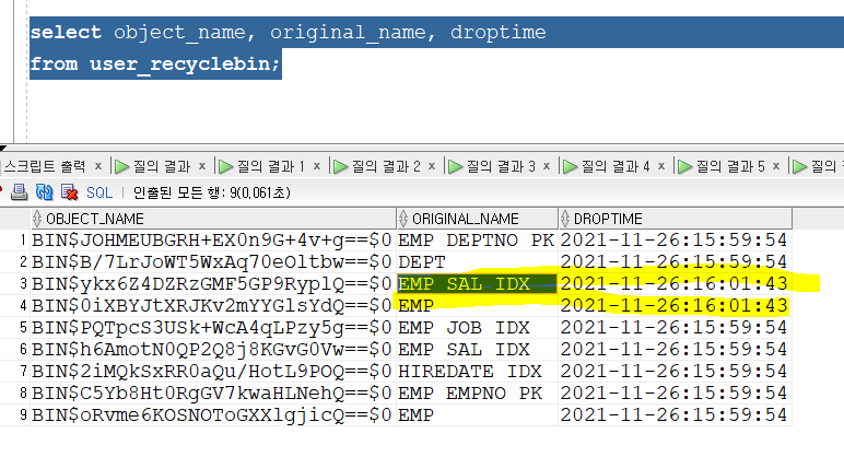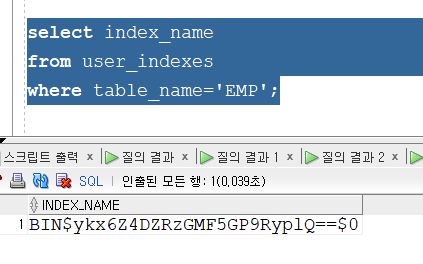 → 확인해보면 emp 테이블과 연관된 인덱스들도 같이 휴지통으로 들어간다.