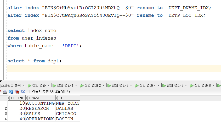 dept 테이블에 loc, dname 컬럼에 인덱스를 걸어준후 dept 테이블을 drop 시키기