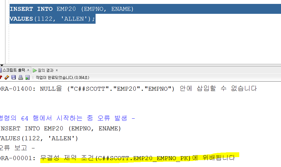 요약하자면, EMP20 테이블의 EMPNO 의 데이터에 중복된 데이터와 NULL 값을 입력할 수 없다는게 확실하게 보장이 되었다는걸 확인 할 수 있다.
