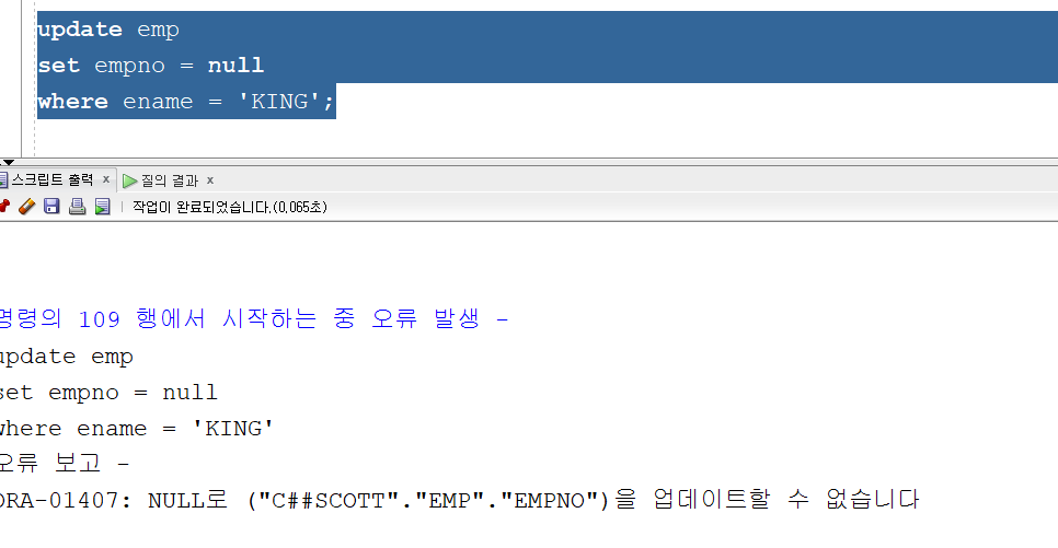 → EMPNO 에 PK 제약이 걸려있어서 NULL 값을 입력 할 수 없다.