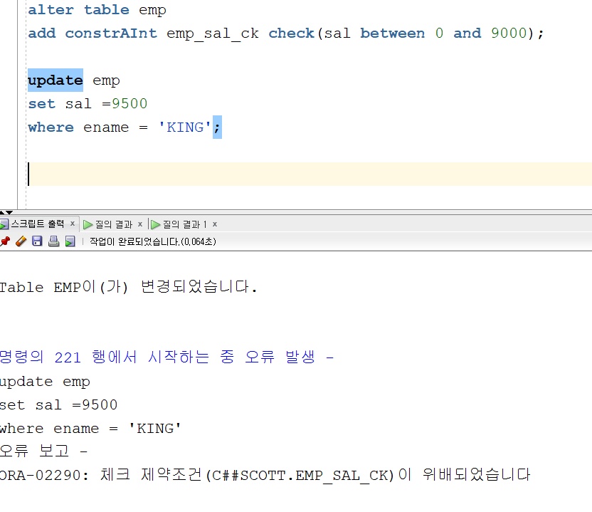 예제 월급이 0~9000 사이로만 입력되게 CHECK 제약 거시오