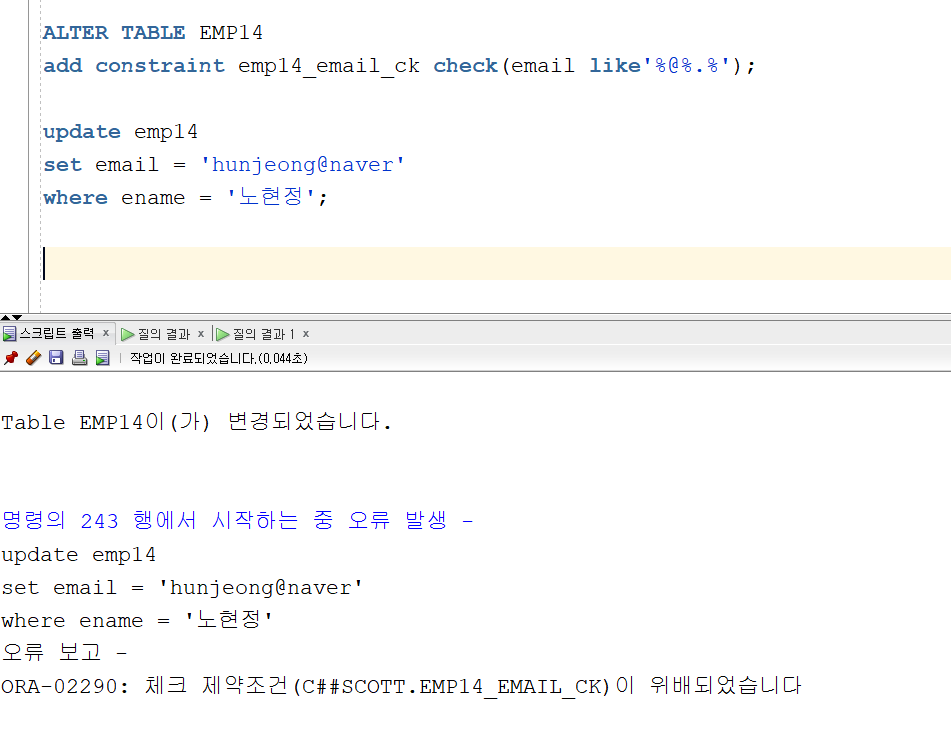 이번에는 이메일에 @ 와 . 이 포함되지 않으면 데이터 입력되지않게 check 제약 조건을 거시오