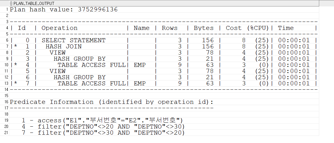 → 튜닝전 sql은 40분이 걸리는 SQL 이였는데 WITH 절을 쓰게되면 부서번호, 부서번호별 토탈월급을 20분이 걸려서 출력하고 그 결과를 임시테이블로 생성하여 (EMP500) 조인하여 출력해서 20분으로 단축 되었다.