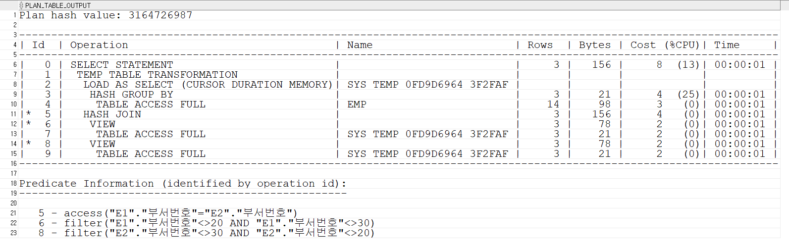 1.번의 temp table transformation 을 해석하면 임시테이블이 생성됬다는걸 알 수 있다.